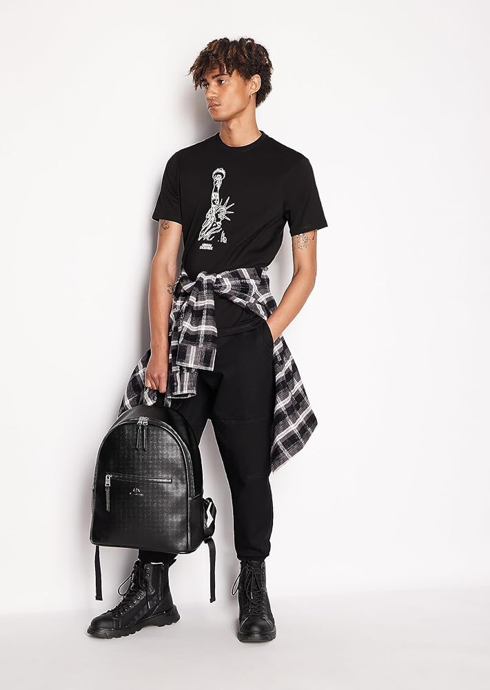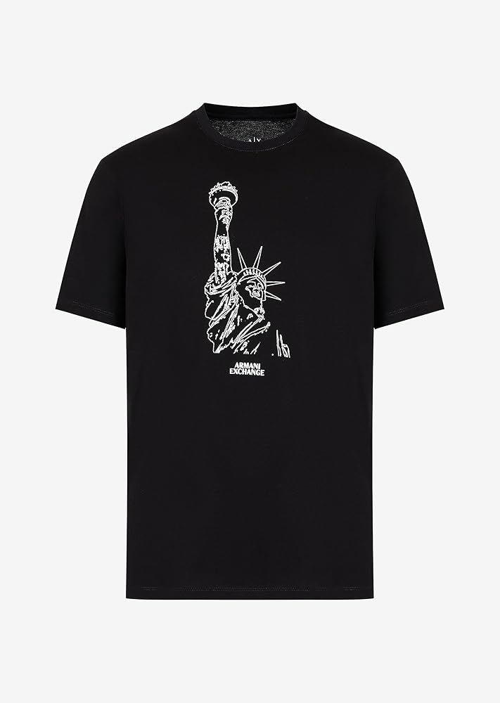 A|X Armani Exchange Men's regular fit, crewneck T-shirt with short sleeves. Sketched Milan Cathedral or Statue of Liberty graphic in front with logo written underneath.
