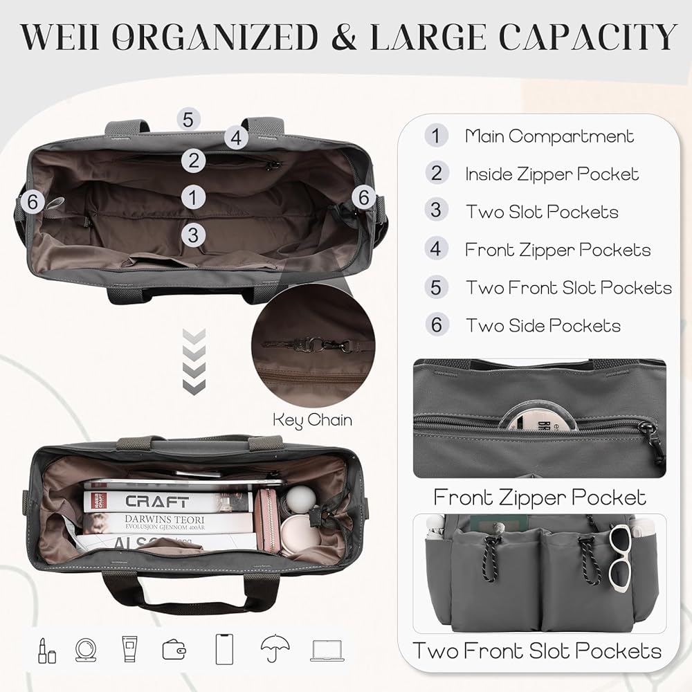 【Upgraded Main Compartment】: This large tote bag for women features an upgraded main compartment, roomy enough. Coming with 2 inner slot pockets and 1 zipper pocket, the teacher tote bag is suitable for books, documents, wallets, cosmetics, water bottles, clothes, and more. This versatile women's tote bag can be used as a beach bag, gym bag, weekend bag, travel bag, or work bag.