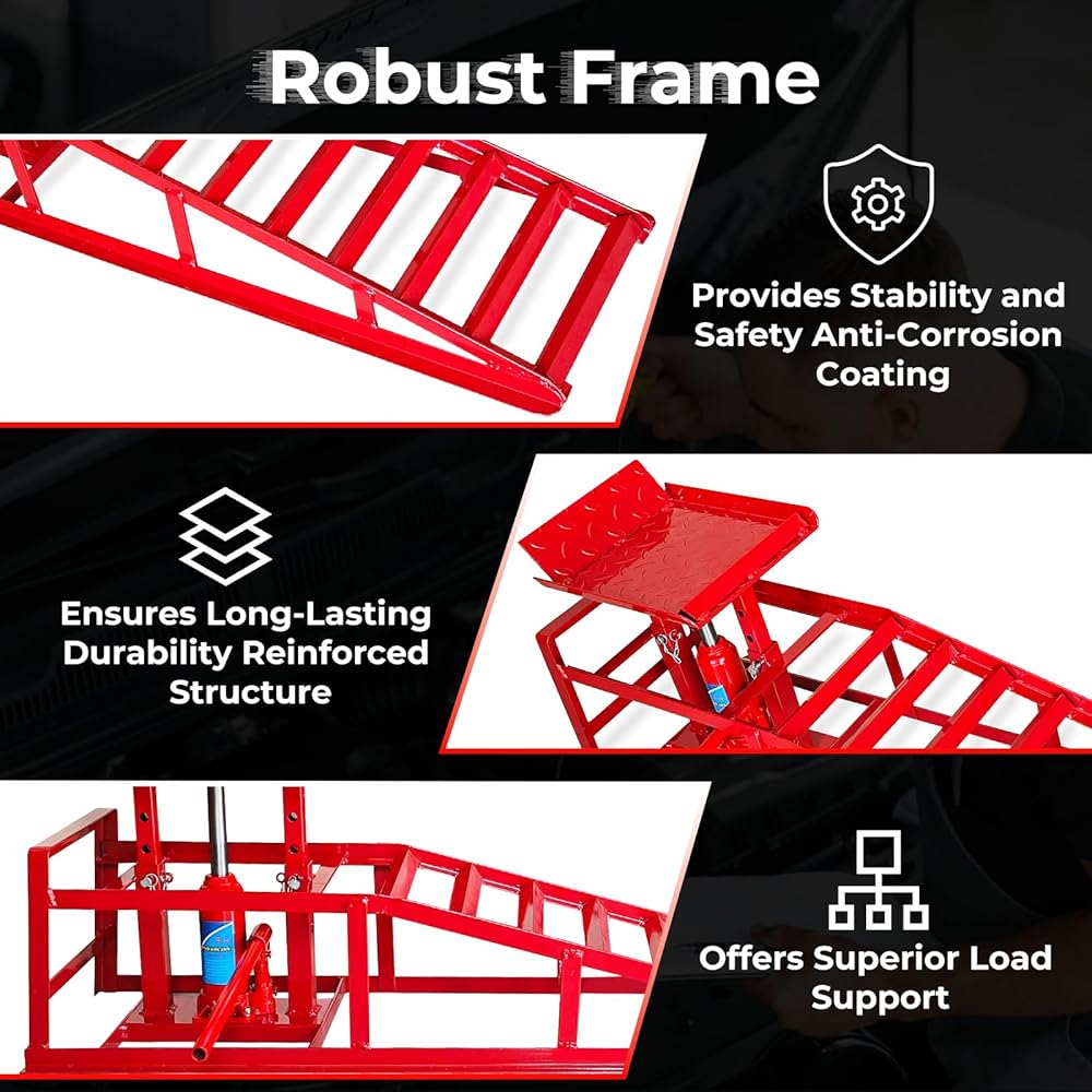 Durable and Safe: Made from premium steel with a rust-resistant coating, these hydraulic car ramps offer long-lasting durability and strength, outperforming plastic ramps in stability and safety.