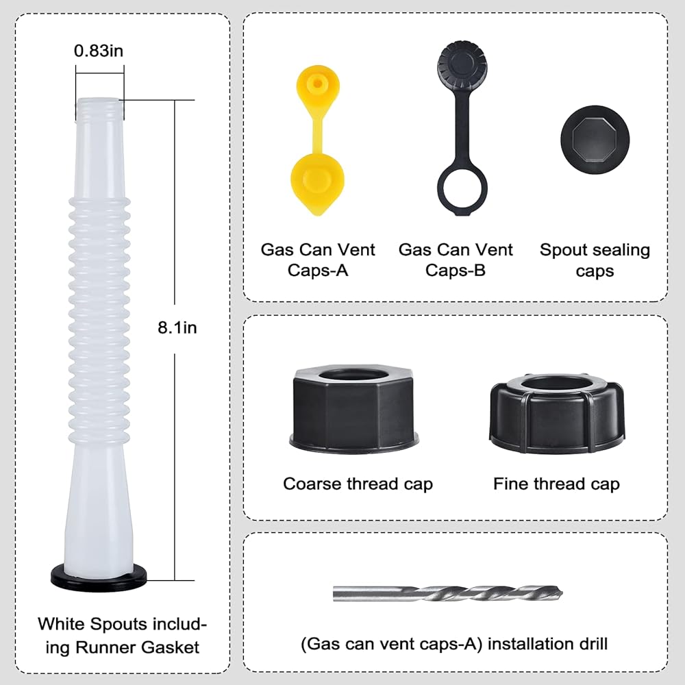 Simple To Install: Each set of products includes, 10 Screw Collar Caps (5 Coarse Thread & 5 Fine Thread) 5 spouts tube and rubber gaskets, 5 nozzle caps with threads, 2 kinds of gas can vent caps, And the drill bit required to install the gas discharge cap. During the installation and use process, if you need assistance, you can contact us, and we will serve you as quickly as possible
