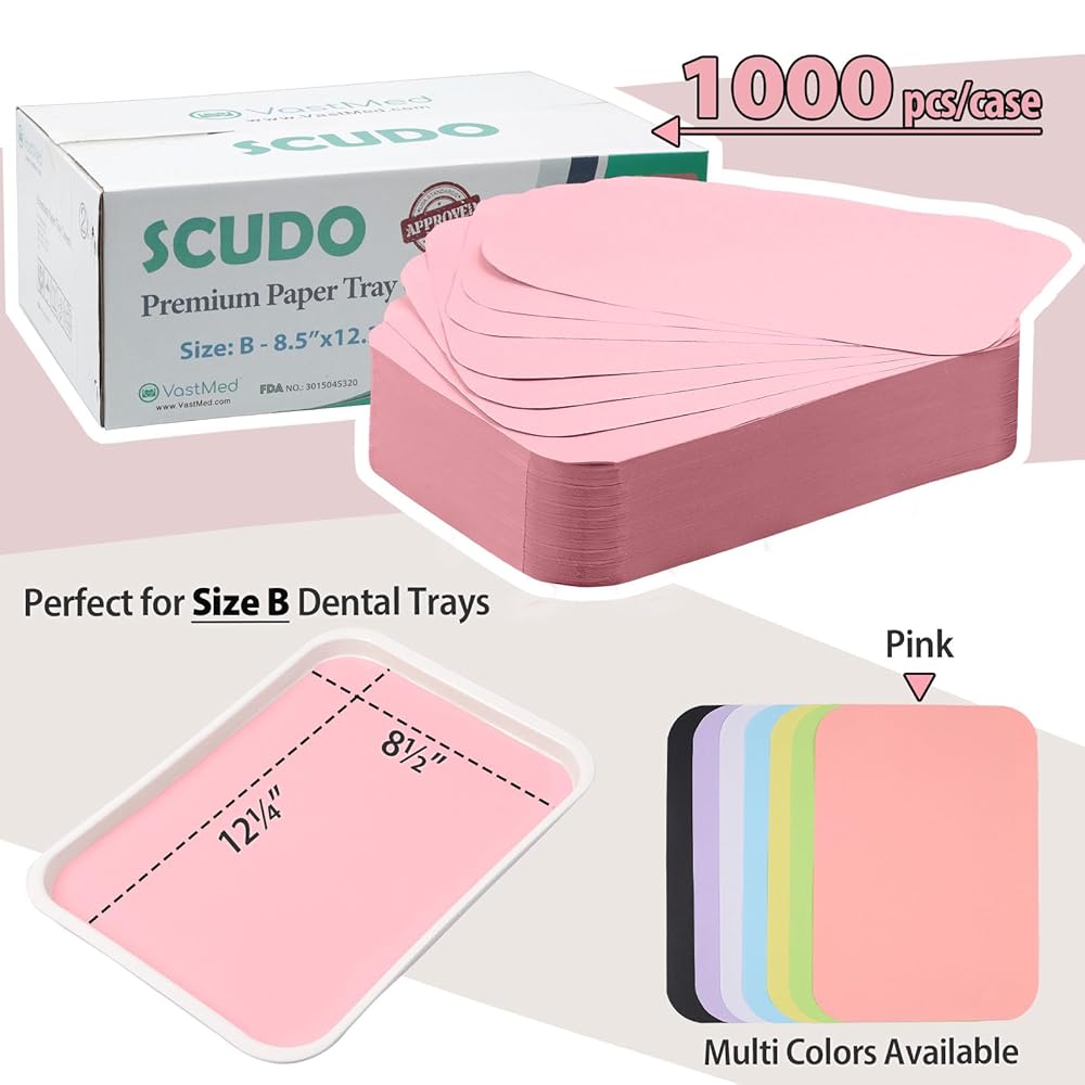 SKUDO Premium Paper Tray Covers 1000 sheets (Lavender) by VASTMED Size B (8.5"x12.25"). It provides excellent protection for your dental tray needs. Its premium, durable material makes for an ideal cover to place dental equipment without having to worry about any wear or tear.
