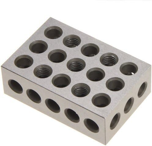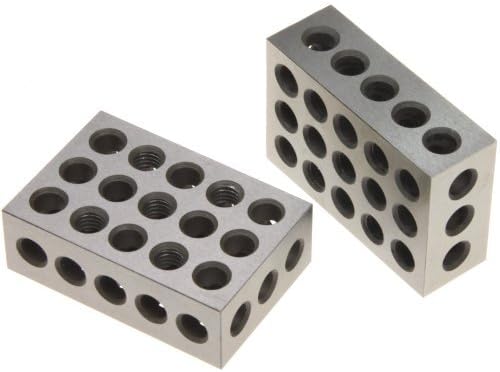 Hardened and precision ground 1" x 2" x 3" Block Set. This matched pair of blocks is ground to tolerances of .0003". 23 holes (5 tapped 3/8"-16 TPI and 18 plain).