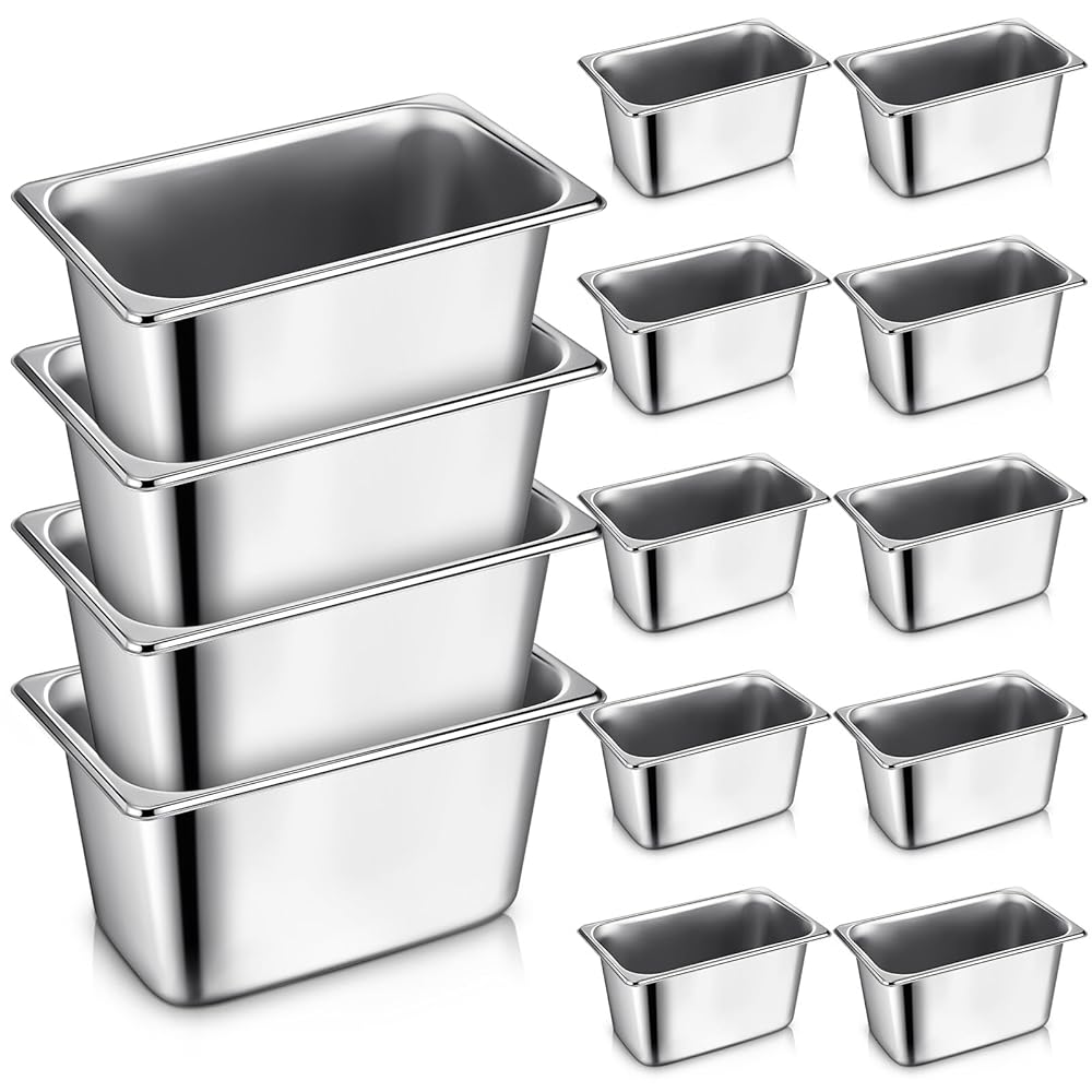 Package Contains: there are 16 pieces of 1/6 size hotel pans, 4 pieces of 6.3 inch stainless steel spoons and 2 pieces of 7 inch food tongs in the package, complete matching combination to meet your daily cooking and activity needs