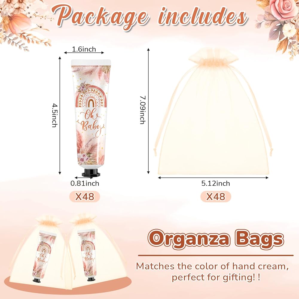 Complete and Convenient: in every purchase of the baby shower hand cream set, you receive 48 pieces of greenery baby shower hand creams in 3 scents, shea, coconut milk and lemon, each scent for 16 pcs, 48 pieces of clear plastic treat bags, and 48 pieces of silver wires, provides a streamlined gifting solution, while the silver wire adds a touch of elegance, making your presents even more appealing