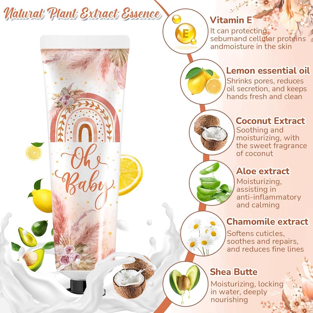 Nourishment for Your Hands: our greenery baby shower hand cream set is natural and fresh, provides a rich and smooth texture that penetrates deep into the skin, offering intense hydration and nourishment that leaves your hands feeling soft, smooth, and rejuvenated, avoiding hand dryness, dry crack and other problems