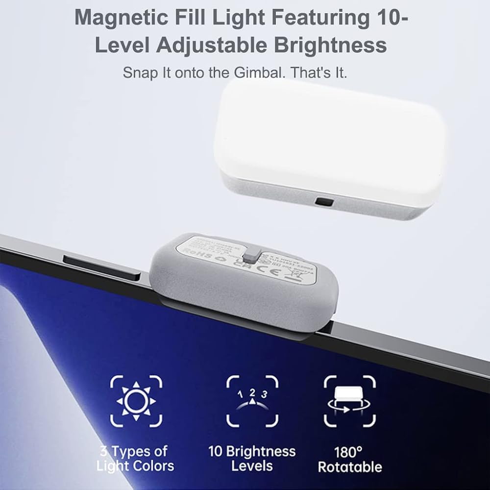 👍👍【Magnetic Fill Light】 Featuring 10-Level Adjustable Brightness,get clear results in all kinds of shots even in the darkness.It can be rotated 180 degrees to accommodate the front and back cameras on your phone for a brighter "you". Surprisingly, it can also function without being magnetized to the gimbal.