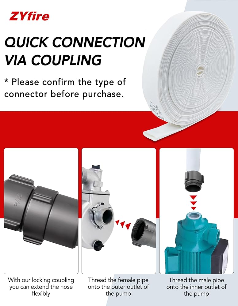 𝐀𝐋𝐔𝐌𝐈𝐍𝐔𝐌 𝐂𝐎𝐔𝐏𝐋𝐈𝐍𝐆𝐒 - One end of the lay flat water hose is a 1-1/2" National Standard Thread (NST/NH) female coupling, and the other end is a 1-1/2" NST/NH male coupling. These couplings are made of aluminum, which is lightweight and highly durable.