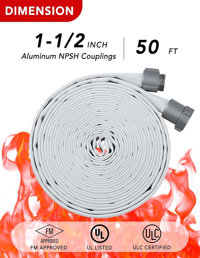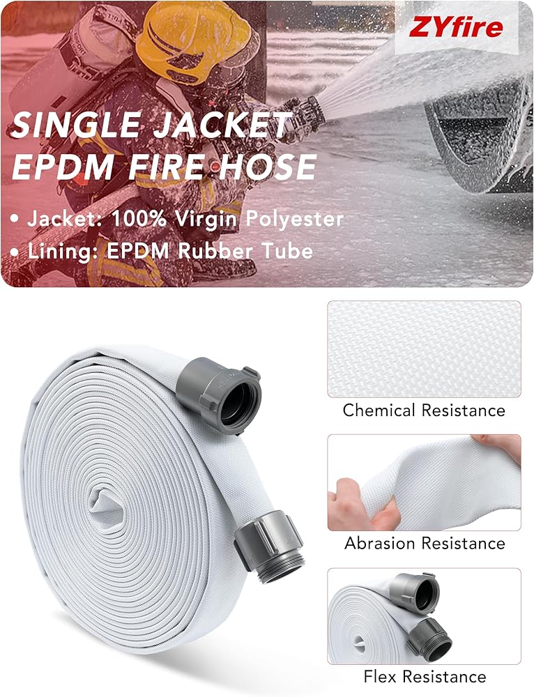 ZYfire Fire Hose - 1-1/2" ID x 50 FT Single Jacket EPDM Firefighter Hose with NPSH Aluminum Couplings 750 PSI Burst Pressure Lightweight for Use in Firefighting
