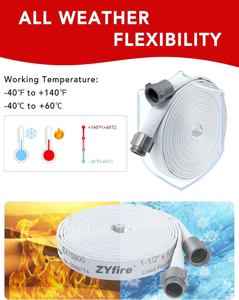 𝐒𝐔𝐈𝐓𝐀𝐁𝐋𝐄 𝐅𝐎𝐑 𝐀𝐋𝐋 𝐒𝐄𝐀𝐒𝐎𝐍𝐒 - The service pressure of the single jacket hose is 250 PSI/17 Bar and the minimum burst pressure is 750 PSI/51 Bar. The temperature range that the hose can withstand is: -40℉~+140℉ (–40℃~+60℃). Whether it is a cold winter or a hot summer, the fire hose can maintain a stable and safe working state without affecting performance due to temperature changes.
