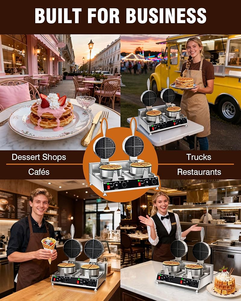 EASY OPERATION & PRECISION CONTROL: No special training is required to operate this waffle maker; users can quickly get the hang of it. The front panel knobs allow you to adjust the temperature 122°F/50°C to 482°F /250°C and 0-5 minutes timer for precise control over the waffle making process, accommodating a variety of sweet and savory toppings for the customers from your restaurant, carnival events and any other commercial scenarios.