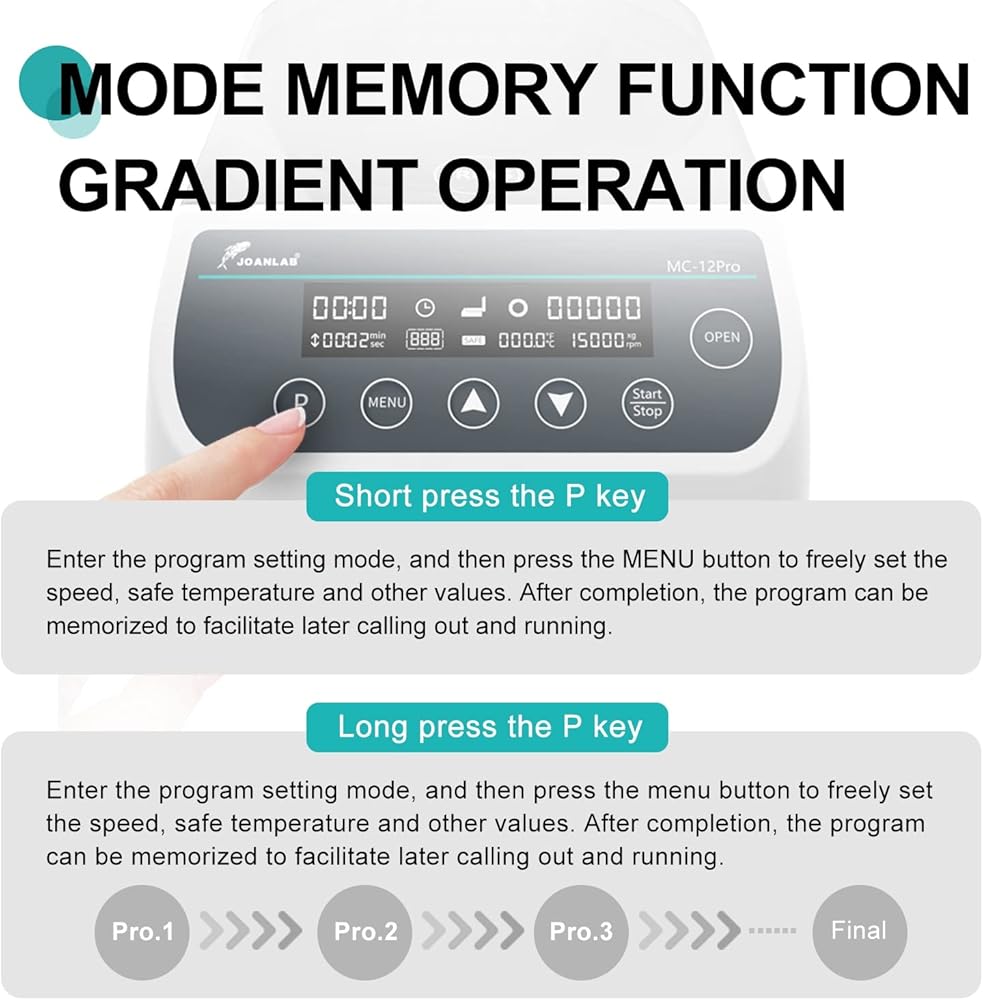 JOANLAB MC serice is perfect benchtop microcentrifuge for your lab to do quick spin downs .With over temperature protection, when the temperature in the centrifugal chamber is too high during operation, the centrifuge machine will automatically shut down and open the lid, the buzzer will alarm for 5 seconds,and the SAFE flashes. Avoid damage to temperature-sensitive experimental samples due to excessive temperature to meet your diverse experimental needs.