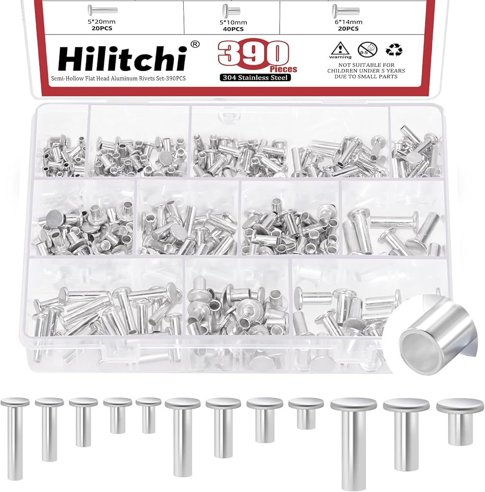 Hilitchi 151PCS M6 Aluminum Flat Head Semi-Tubular Rivets with Punch Assortment Kits Aluminum Round Flat Head Rivet Silver Round Semi Tubular Rivets for Craft Repairs Decoration