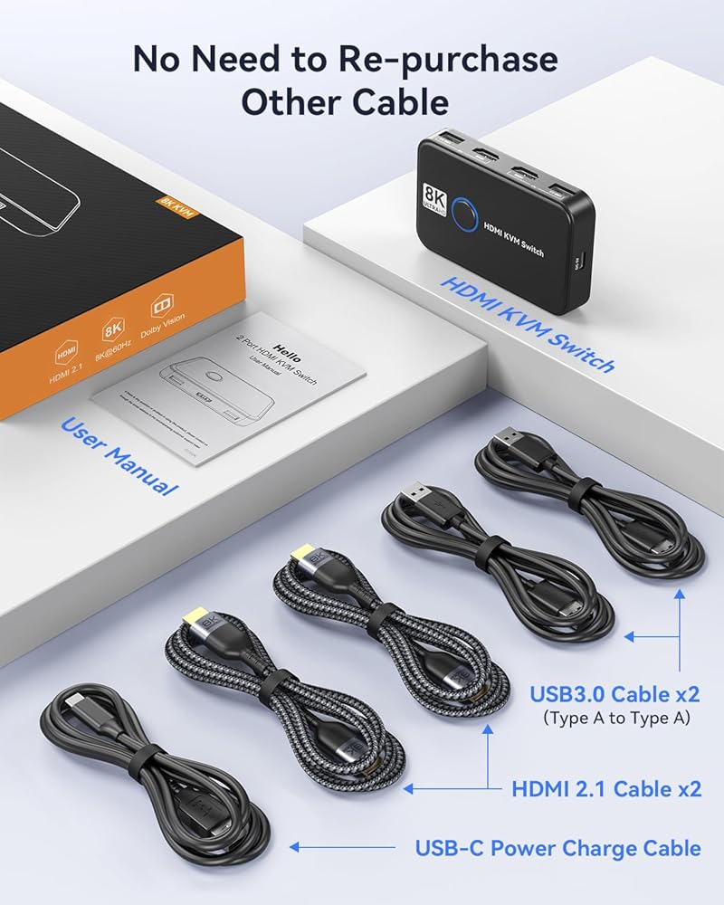 【All-inclusive Package】The package includes a "4 port HDMI KVM switch", a manual, and two sets of USB 3.0 and HDMI cables (40 inches/1m). So whether you're looking for a "sharing switch for keyboard two computers" or a "home office KVM" or simply a device to connect "2 computers one monitor switch", this product has got you covered