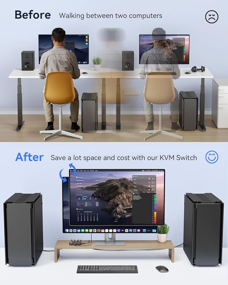 【Ultimate USB KVM HDMI Switch】Step up your tech game with our advanced keyboard KVM switch. This HDMI USB Switch KVM makes it easy to control 2 computers with one set of controls, including a monitor, mouse, keyboard, and printer. Toggle between two PCs using the "2 port KVM switch" function for a more efficient workflow. Perfect for gamers user.