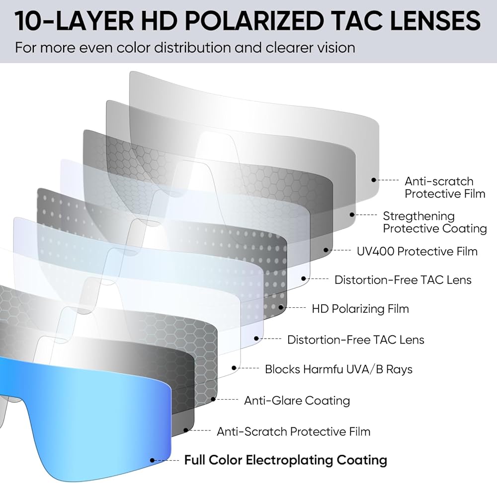 Professional Lens coating: The lenses are treated with a premium color coating technology that ensures consistent color perception without unnatural color shifts; These polarized sunglasses men and women reduce distraction caused by color inconsistencies and are crucial for maintaining color stability during outdoor activities