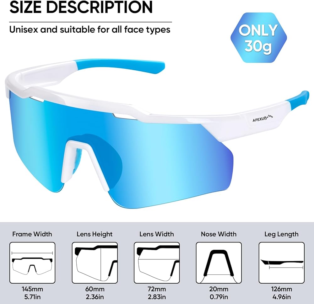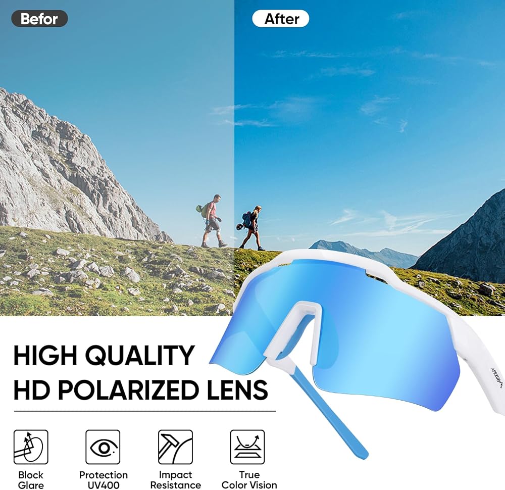 Comfortable Fit: These sport sunglasses men and women feature an ultra-lightweight frame with adjustable rubber nose pads and anti-slip design. The mens polarized sunglasses ensure a secure, custom fit for all face shapes and maximum comfort during prolonged wear