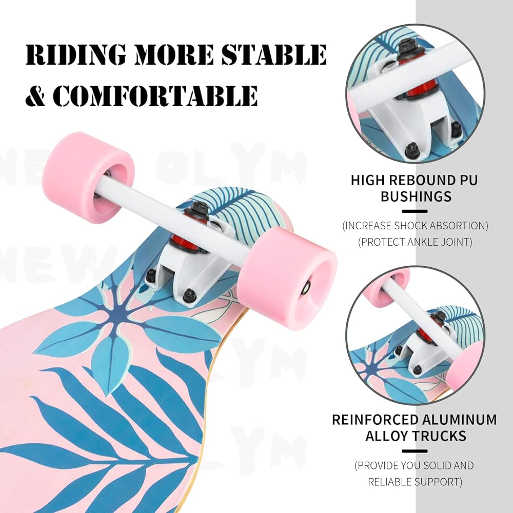 STURDY & STRONG: Our skateboard made of High Quality Thick Aluminium Trucks Heavy-Duty Aluminum Alloy Trucks and steel axle, making them reliable and sturdy ;Drop deck keeps your center of gravity low for pushing and off-roading