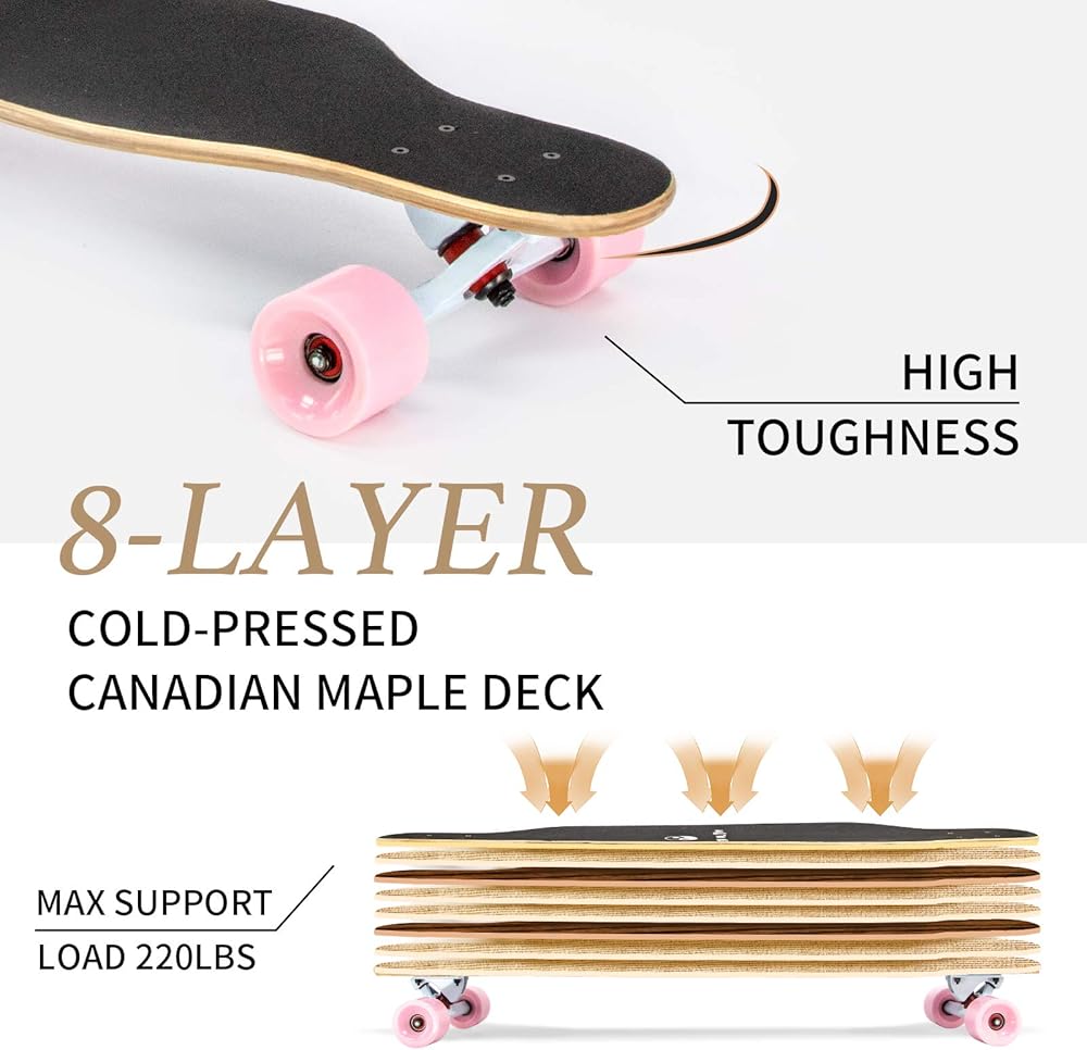 DURABLE & STABLE: Super strong 8 layer grade of Canadian maple wood skateboard with emery non-slip surface provides stable and strong grip during skating; Maximum support weight 660 lbs, fit for adults and kids