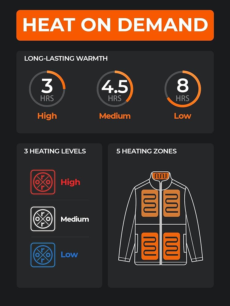 - Five Heating Zones: Strategically placed in the hand pockets, collar, and left & right back to deliver up to 8 hours of warmth across a larger area.