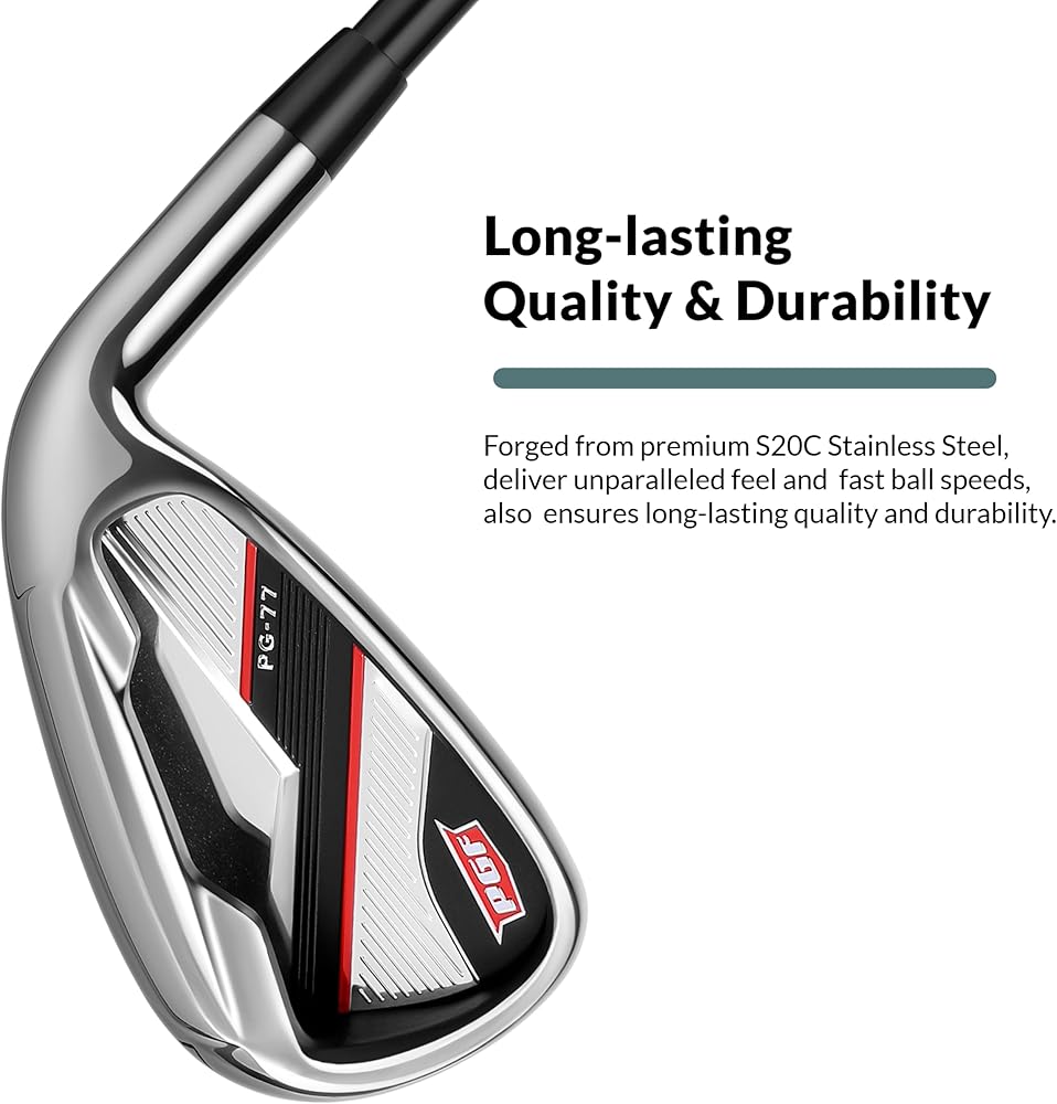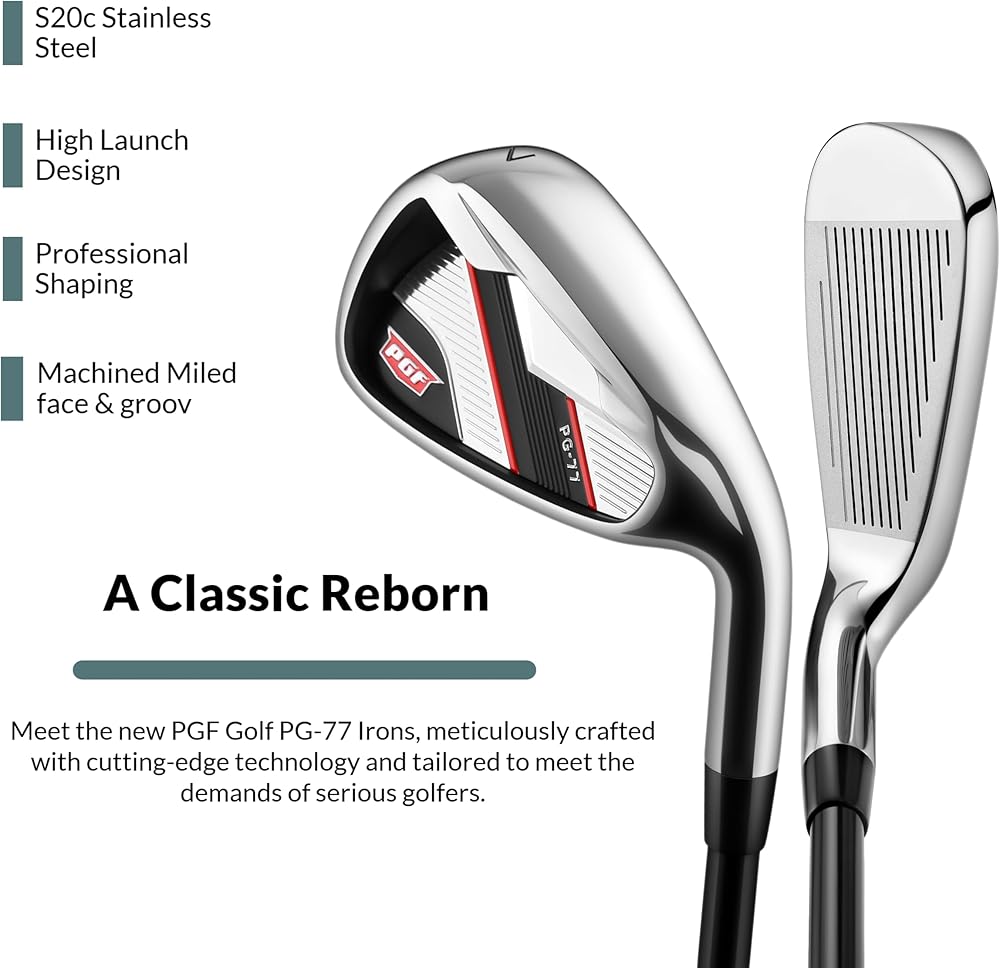 A classic reborn: Meet the new PGF Golf PG-77 Irons, meticulously crafted with cutting-edge technology and tailored to meet the demands of serious golfers. Forged from premium S20C stainless steel and precision-machined to perfection, these irons offer the consistent speed and feel players desire. Enhanced with low-profile hosels and tour-spec Graphite shafts, they redefine the standard for excellence on the course.