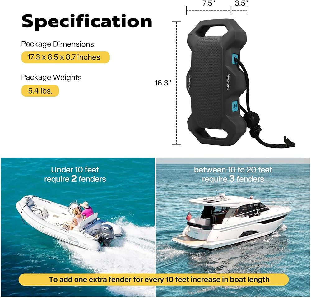 BOAT FENDER SIZE - The VIVOHOME Boat Fenders measure 16.5 x 7.4 inches, catering to a diverse range of boat sizes; Generally, for boats with a length under 10 feet, it is recommended to use 2 fenders, while those between 10 to 20 feet usually need 3 fenders; Following this analogy, it is recommended to add one extra fender for every 10 feet increase in boat length to ensure complete protection