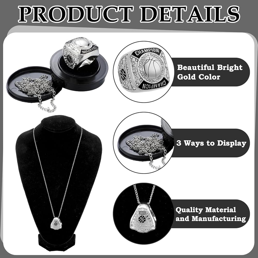 Our basketball rings come with different display options. They can be worn on the finger, around your neck with the equipped chain, or placed on the stand display case, a versatile award to show off in various ways.