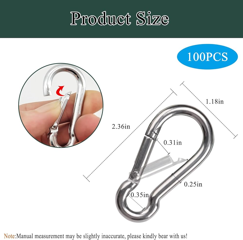 Carabiner Clip M6: Package contains 100 pack silver spring snap hook, ideal for versatile bundling, anchoring hardware, measures 2.36 X 1.18 inches, see size image for detailed specifications