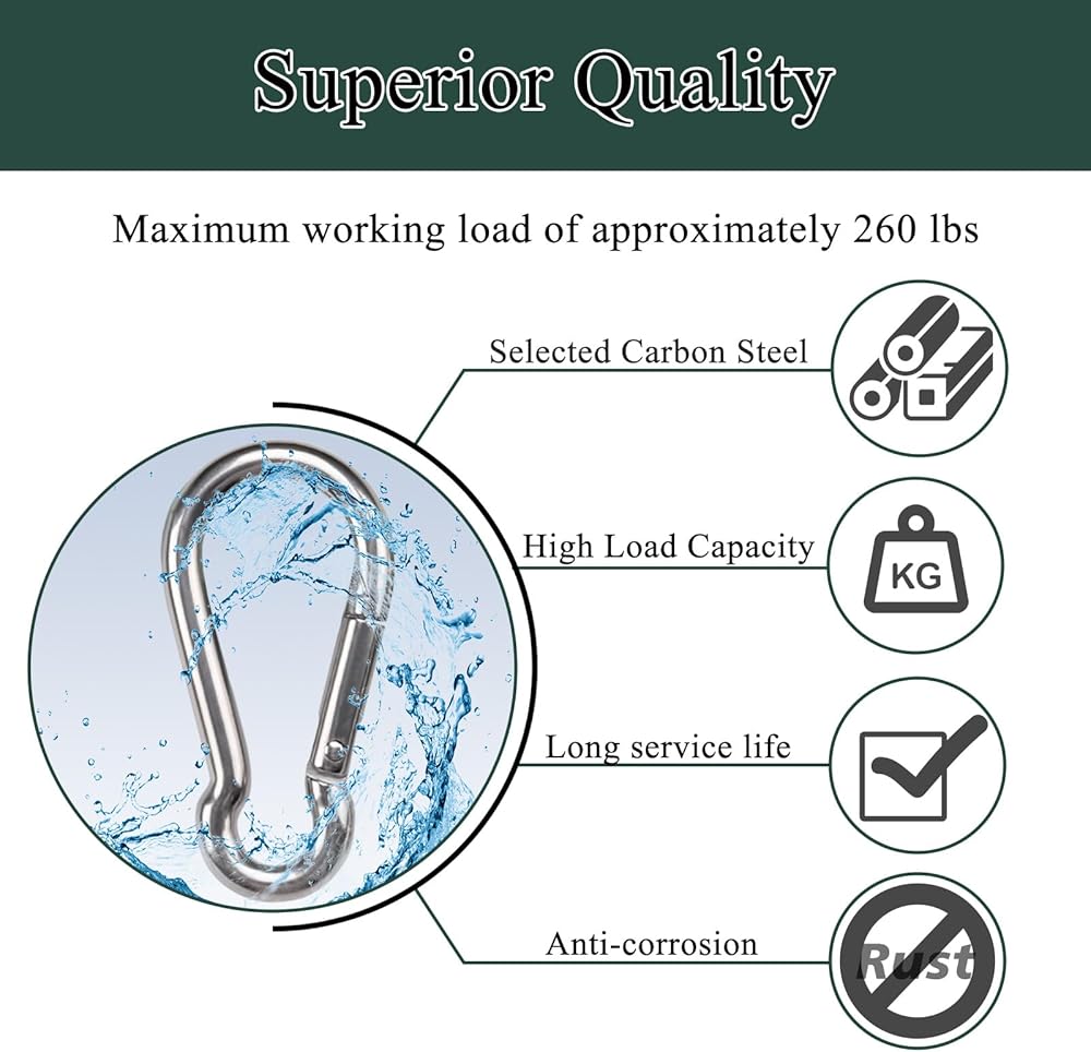 Well-crafted Snap Hooks:Carabiner hook excellent resistance to rust and corrosion while boasting a smooth, glossy surface with no sharp edges. Moreover, they are highly resilient to wear.