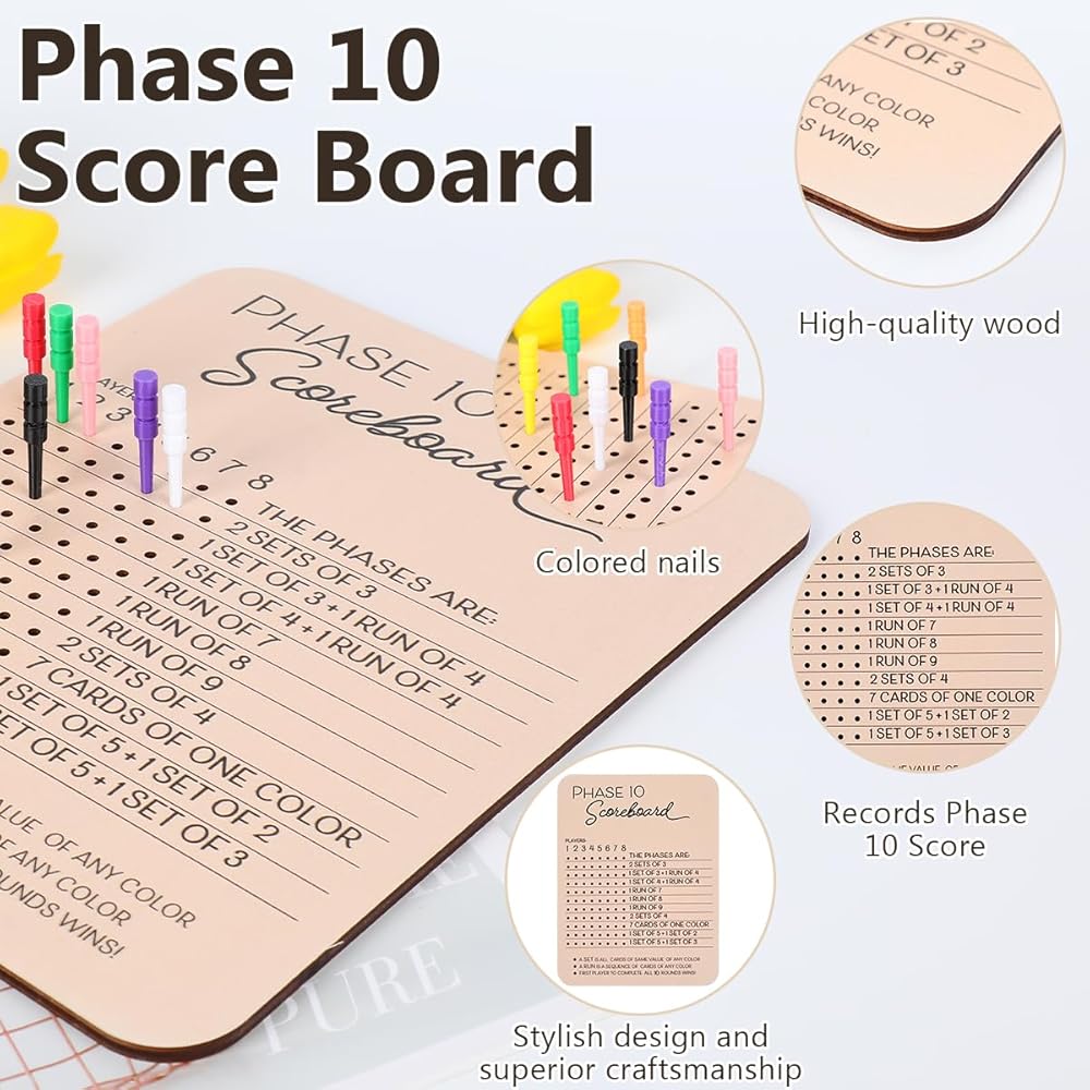 【Wooden Phase 10 Scoreboard】Our phase 10 scoreboard is made from 3 wooden boards that are carved and combined into a layered card for a sturdy construction that ensures durability and reliability
