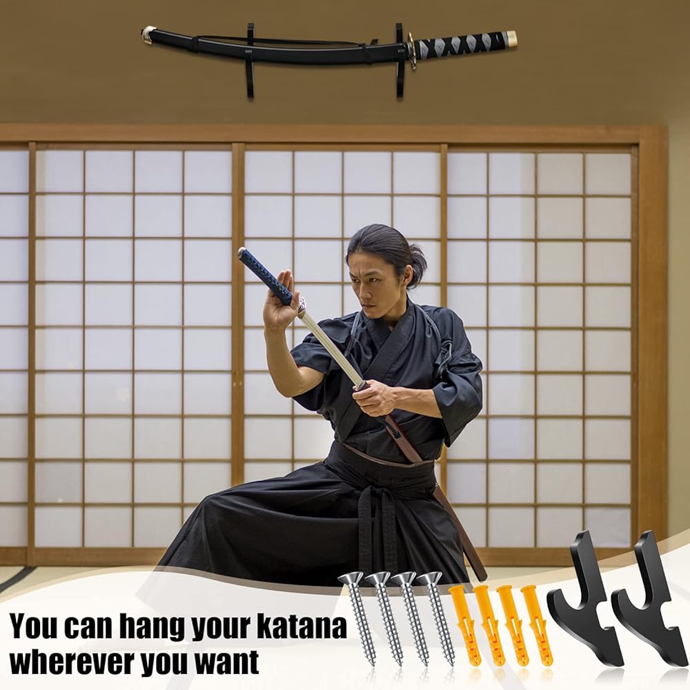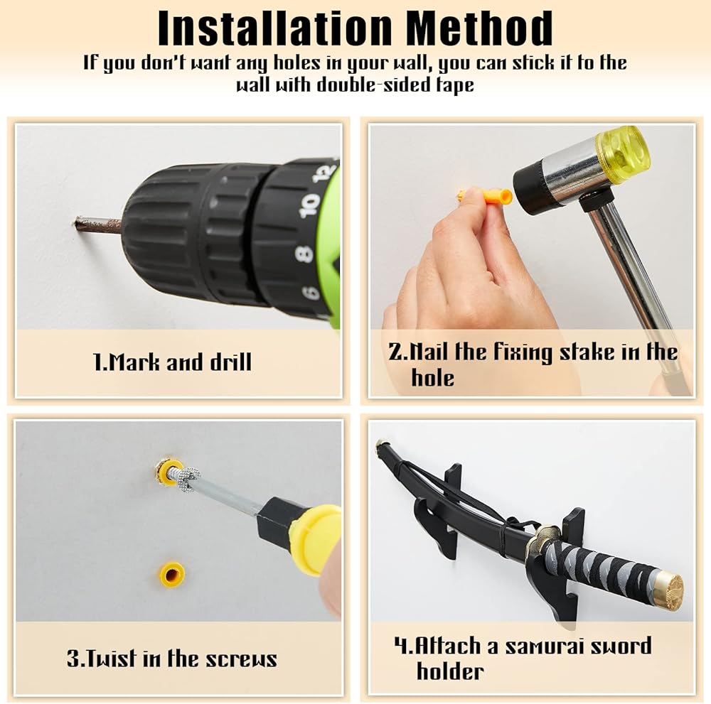 A hanging hole is designed behind each wall sword mount. You just need to install the equipped nails on the wall, then you can fix our weapon rack easily and firmly.