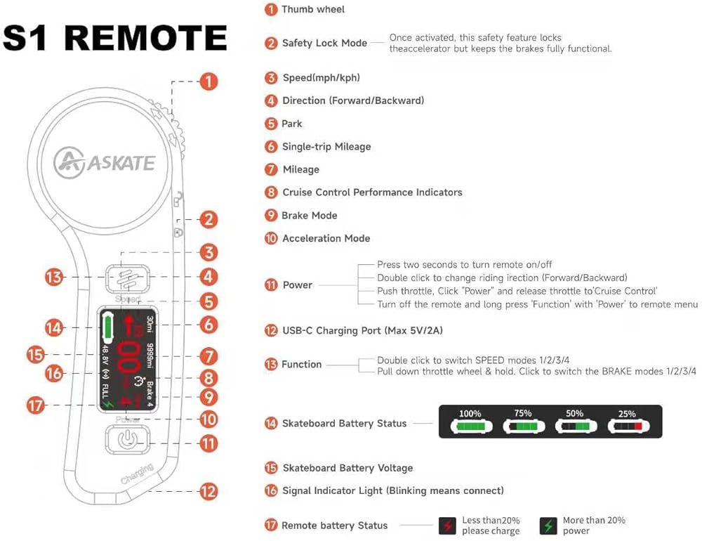 User-Friendly MR Remote with Screen: The MR remote control features a high-definition LED screen that makes it easy to monitor your skateboard's battery level, view instant speed and log mileage, and offers four speed and brake modes. This makes it perfect for beginners and teens, and is both safe and controllable as well as convenient when riding.