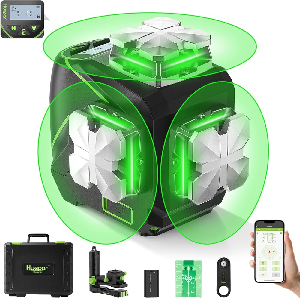 Huepar Laser Level, Self Leveling 12 Lines Cross Line Laser with LCD Screen 3 x 360° Bluetooth Connected Green Beam Laser Tool, 3D Horizontal & Vertical Laser Line -Remote Control&Rechargeable Battery