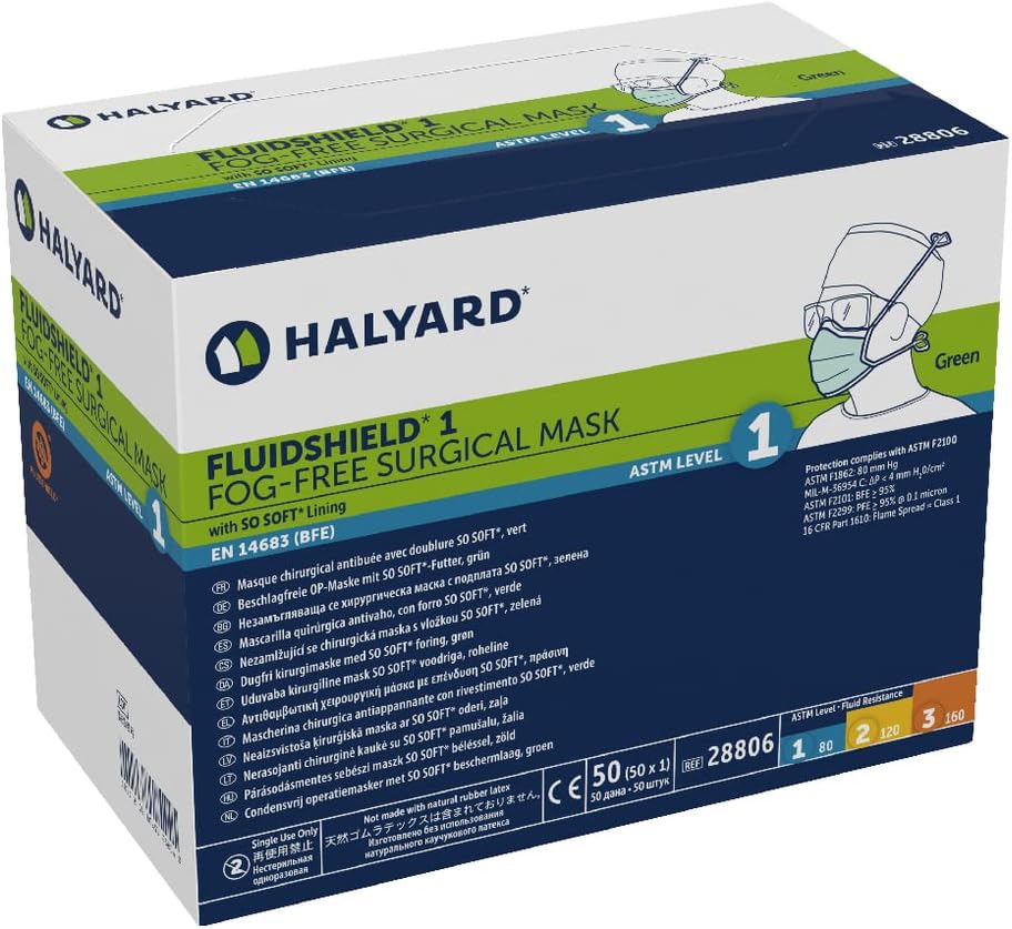 - Halyard FLUIDSHIELD Masks with ties meet ASTM F2100-11 Level 1 standards