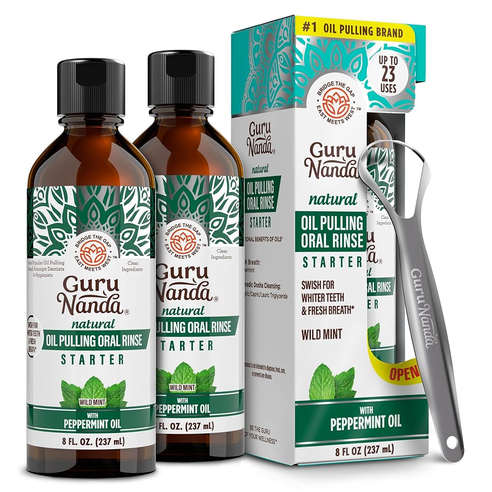 GuruNanda Whitening Pulling Oil is a natural, pre-brush rinse inspired by Ayurvedic wisdom. It comes as a 8 oz bottle with a stainless steel tongue scraper and a butter on gums toothbrush inside the box. It helps to promotes fresh breath & a clean mouth.