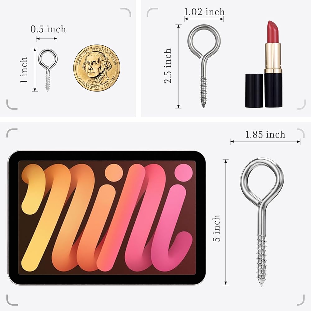 STURDY AND DURABLE MATERIALS: Screw eyes are all made of high quality 304 stainless steel, and the surface coating metal treatment process makes this type of eye hooks screw less prone to corrosion. Although small in size, it can bear certain weight of items and meet daily use requirements.