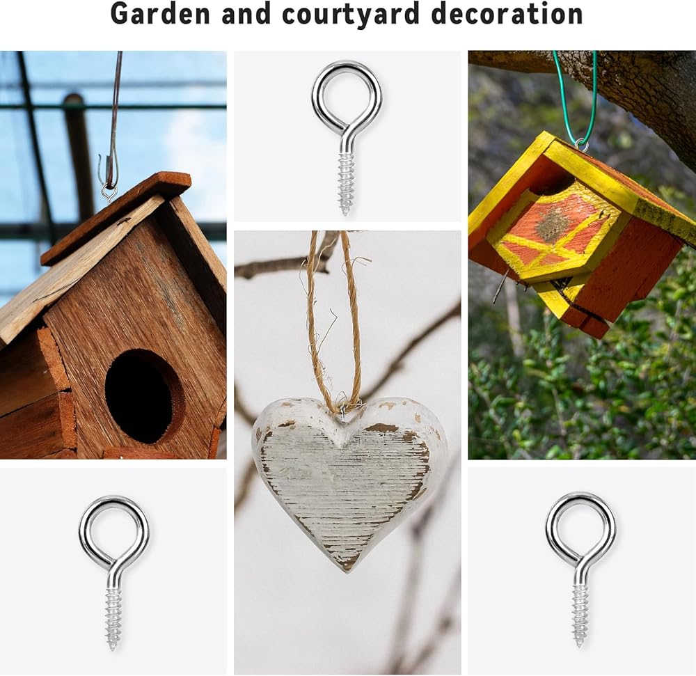 WIDE APPLICATION RANGE: Small eye hooks can be used in many different scenarios and materials. Whether it is metal, wood or plastic, it can provide a stable connection. For example, hanging photo display boards in the house, and fixing small birdhouses or bird feeders in the courtyard.