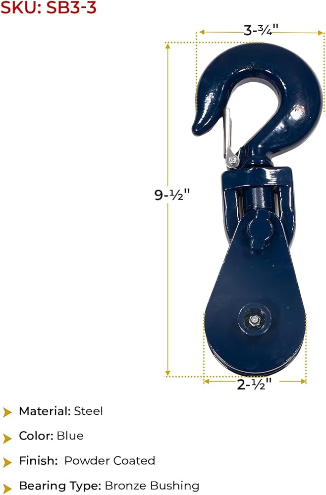 Steel Construction: This 8 ton snatch block is manufactured using heavy-duty steel and is durable and resistant to wear and tear. It is suitable for industrial operations such as construction, forestry, towing, and lifting. This snatch block is designed for indoor and outdoor applications. It comes with a powder-coated finish that protects against rust, corrosion, and environmental wear.