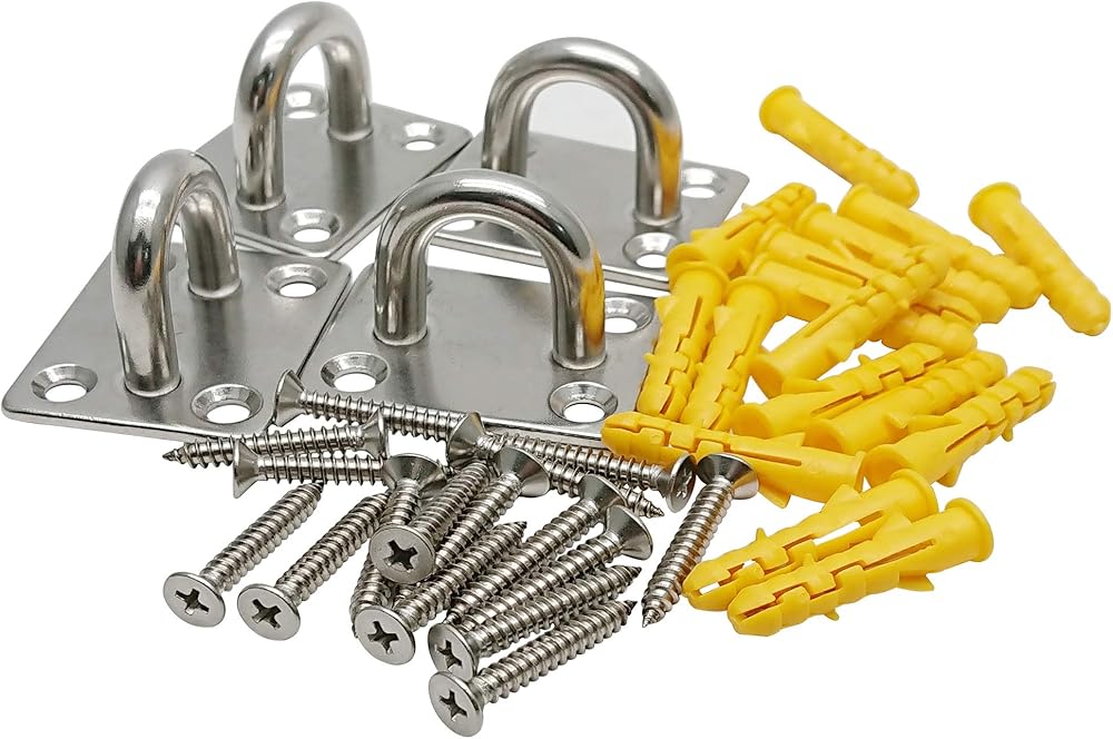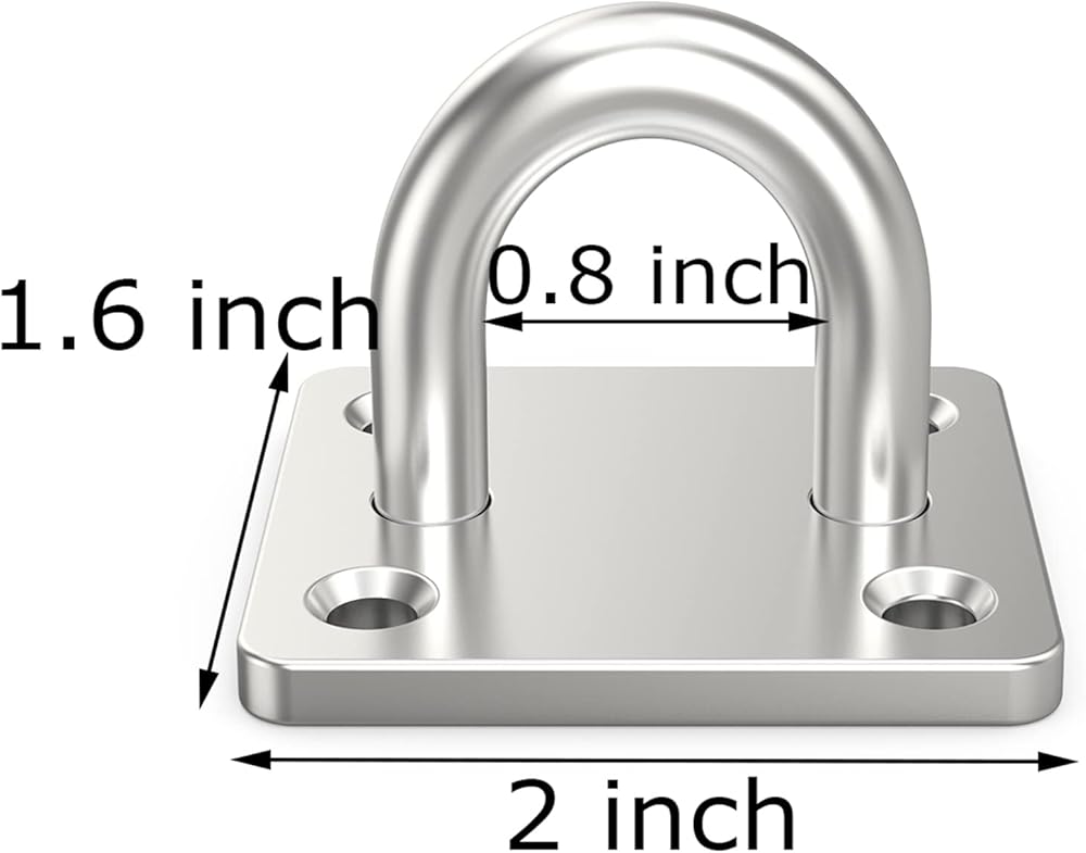 2 x 1.6 inch Strip Type Eye Plate with Enclosed Hook, 304 stainless steel processed, rustproof, Wide Application, Our Pad Eyes for various kinds of buckles, Mainly used for ceiling & wall mount hanging hardware fitting, also used in small yachts and boats, Load-Bearing: 300 lb, Suitable for wooden ceilings, concrete ceilings, brick walls, boats, hammock chairs, wire ropes, chains, hanging plants, indoor or outdoor installation.