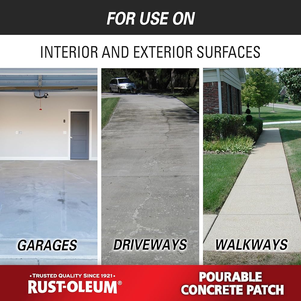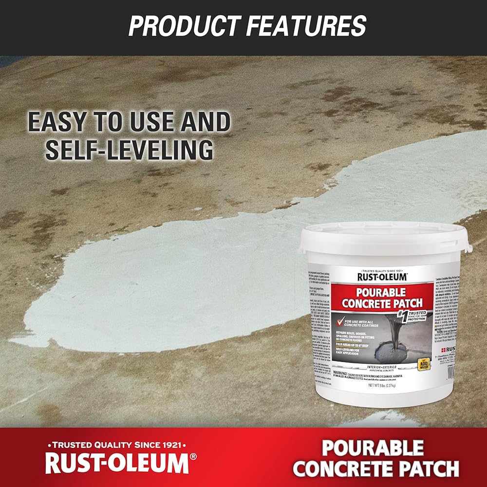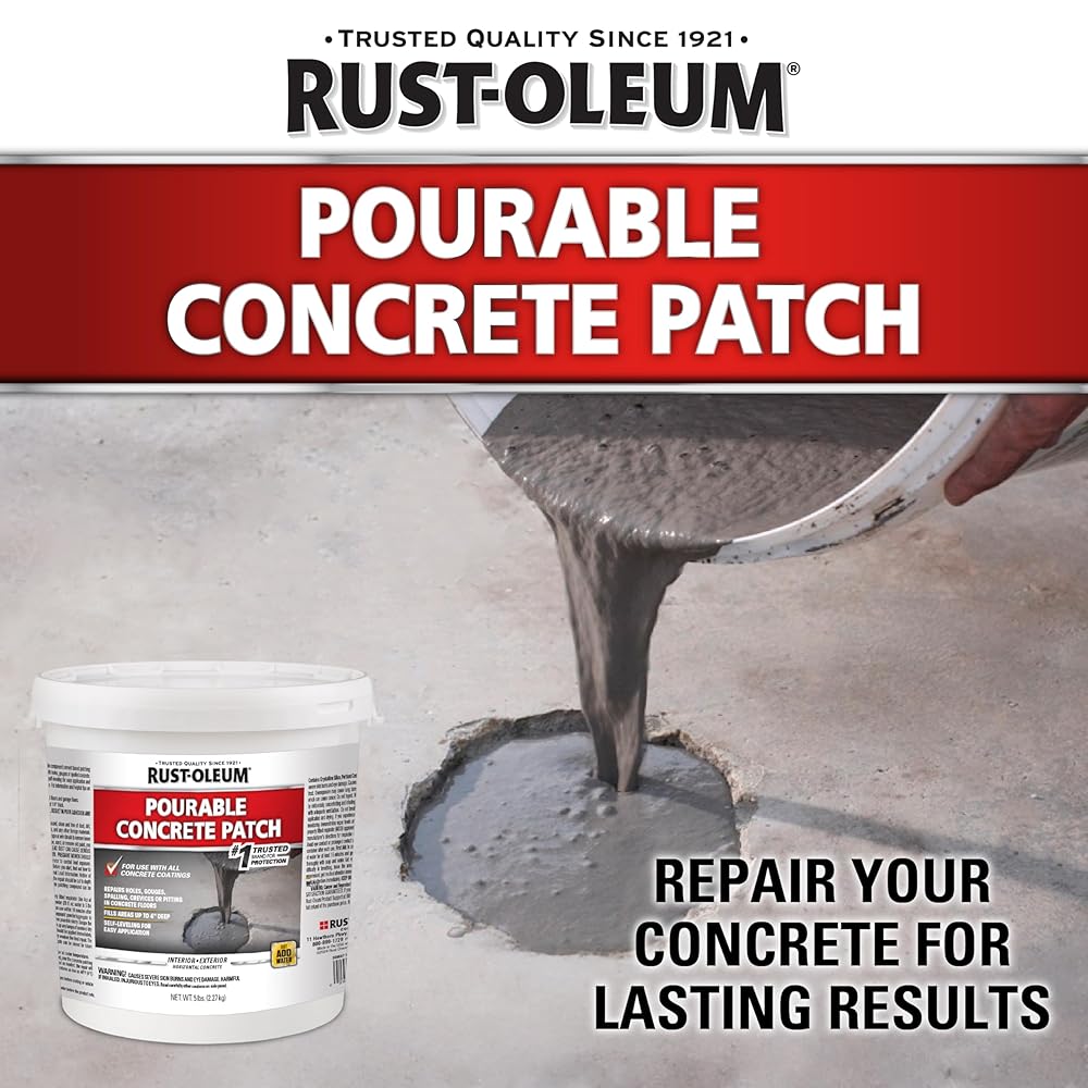 Rust-Oleum Pourable Concrete Patch is a fiber reinforced patching compound designed to quickly and easily repair large holes and spalls on concrete flooring surfaces. This product has a fast return to service time, accepting vehicle traffic in as little as 3 hours. Just add water, mix and pour. For use on interior and exterior concrete flooring. Compatible with any Rust-Oleum Concrete Floor Coating product.