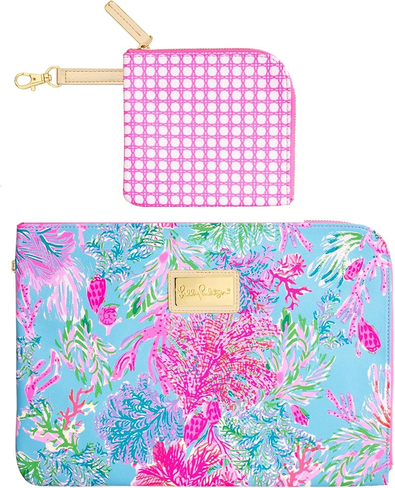 Keep your portable tech devices safe and sound in this stylish and compact pouch set. The large zip pouch holds tablets and iPads and has a handy pocket on the interior to keep your Apple pen secure. Plus, laptop case 13 inch comes with a small zipper pouch to store your charging cords, earbuds, and other must-have accessories. The zipper laptop sleeve case is featured in a multicolored Lilly Pulitzer print, with a metallic gold edging and metal logo plaque for an upscale look. Women's tech case easily stores up to 13 inch laptops, tablets, and more. Lilly's electronics organizer makes the perfect travel accessory, no matter where the day takes you. THIS ITEM IS NOT INTENDED FOR USE BY CHILDREN 12 AND UNDER.