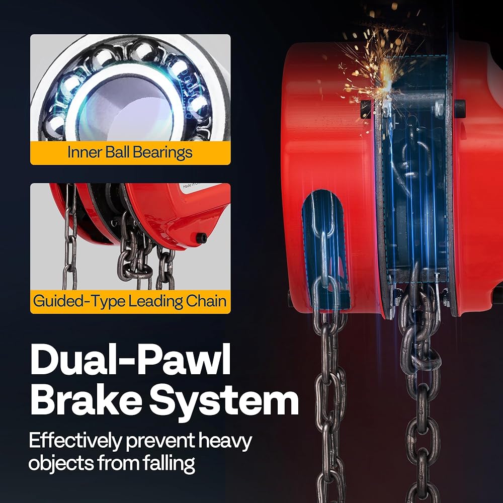 EXCELLENT CAPACITY: This lightweight and compact chain hoist boasts impressive strength, with a load capacity of up to 6600 lb; The guided-type leading chain device ensures smooth operation when pulling heavy objects, reducing the inconvenience caused by clogging chains and excessive noise
