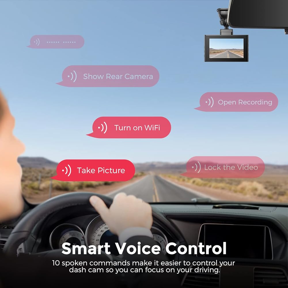 【Hands-free Voice Control】 The voice control function allows you to control the dashboard camera with English voice commands. With your hands on the steering wheel, you can say commands to take picture, lock the video, open recording, turn on WiFi, turn off WiFi/recording etc. Everything becomes easier and more convenient.