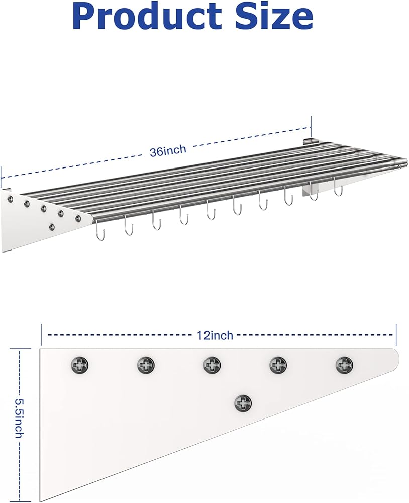 Metal Kitchen Rack for Storage and Organization, [NSF Certified] 12" x 36" Stainless Steel Wall Mount Shelf with 10 S Hooks for Hanging Pots, Pans, Cookware in Home and Restaurant
