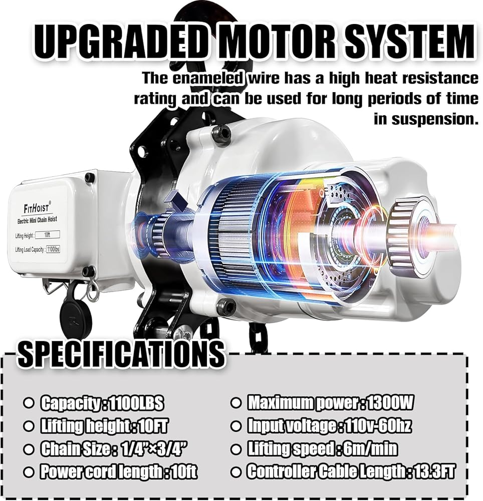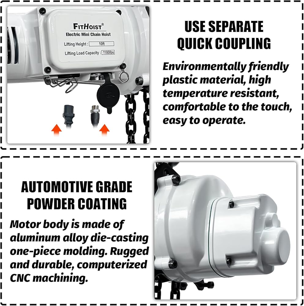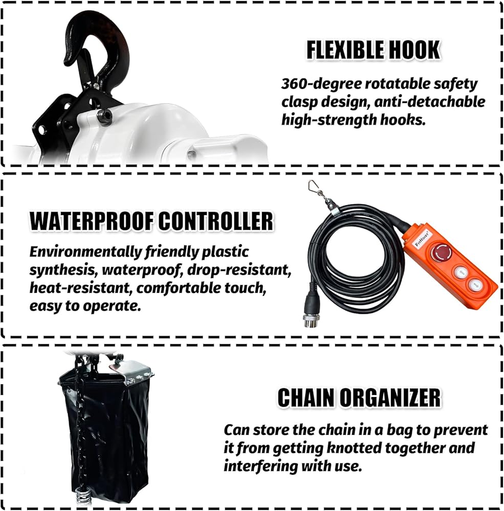 【POWERFUL PERFORMANCE 】Electric Chain Hoist is designed for ifting and moving heavy duty applications.The tough,heavy-duty motor has a voltage of 110V/60hz and a power of 1300W.The electric chain hoist easily handles 2200Lbs loads and can lift loads to a height of 9.8 ft at a rate of 3 meters per minute.