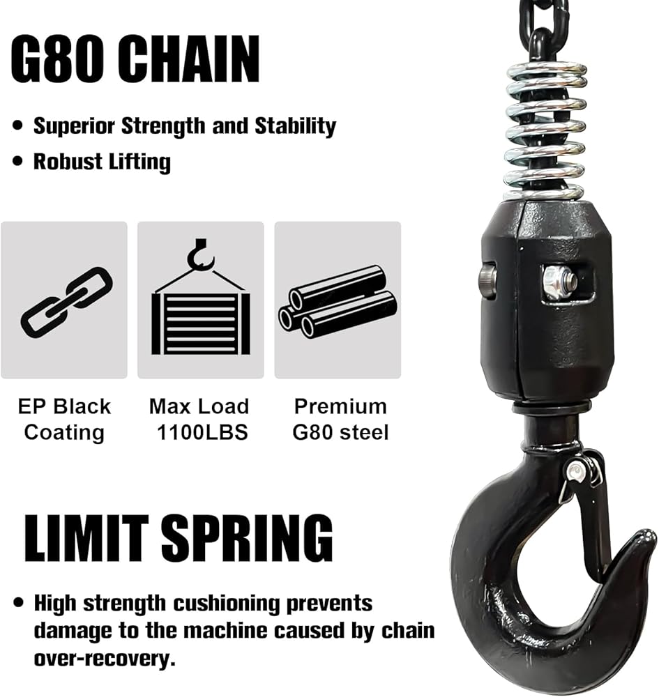 【STRONG AND DURABLE】The aluminum alloy housing,G80 chain with heat treatment,and manganese steel hook have high strength and good rigidity to resist abrasion,corrosion, impact,and deformation. It produces low noise.