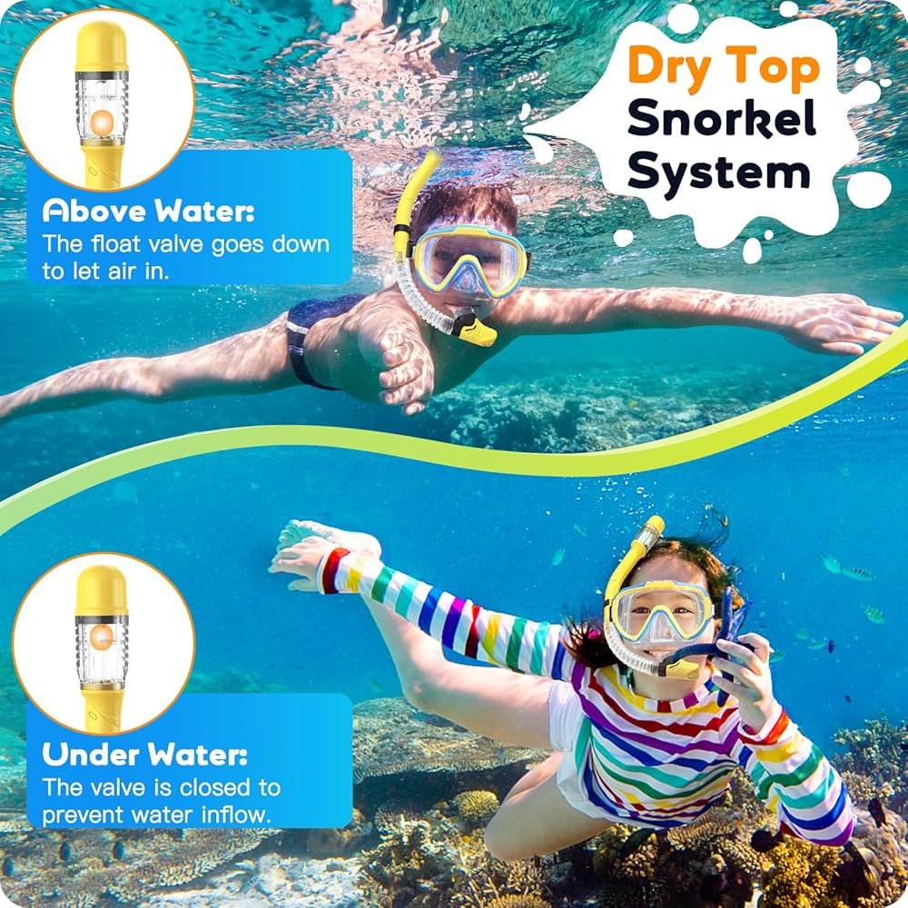 • 🌊ANTI-SPLASH DRY TOP KIDS SNORKEL SET - Seovediary kids snorkel boasts an ingenious dry top anti-splash system. The floating ball on top automatically seals the entrance when the tube is underwater, and the one-way inhalation valve efficiently drains water out to keep the snorkel dry, prevent any risk of choking, ensures maximum safety for your litter ones
