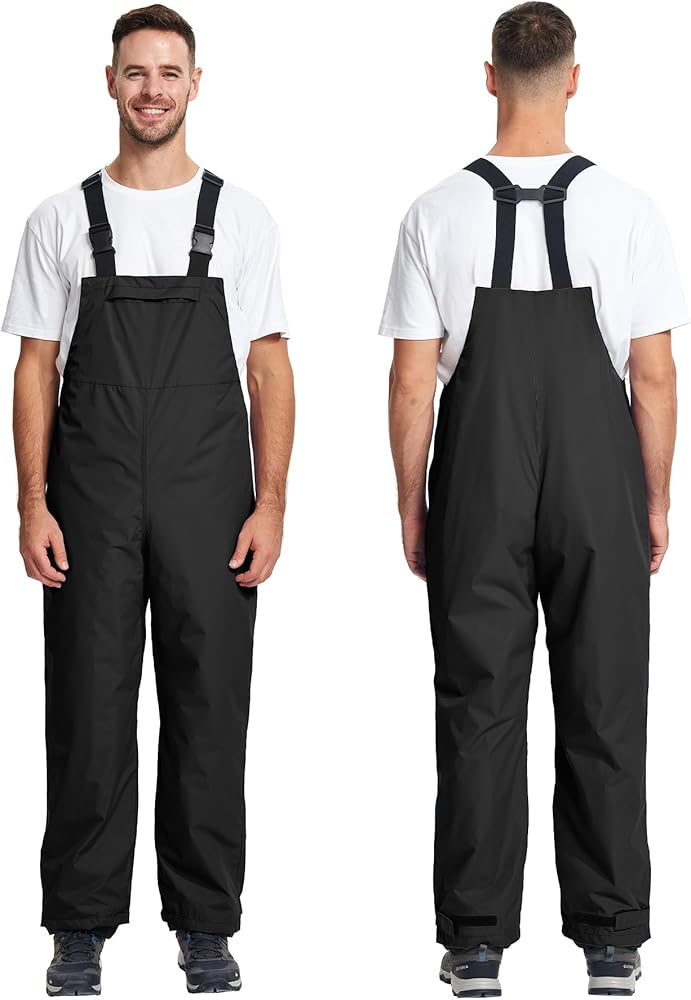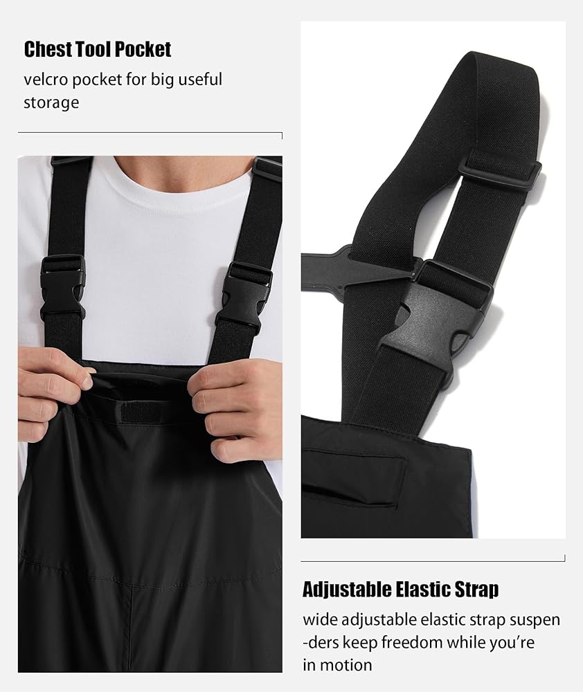 【Innovative Rain Bib Pants】Men's rain bib pants has been innovatively upgraded the straps more wider that make it comfortable and adjustable elastic strap suspenders that keep your pants up and stay in place while your in motion.Velcro foot openings can be zipped open or closed to allow a looser fit any boots,even thick fishing boots or winter gear on. Baggy legs provide space for full range of motion during fishing sailling work