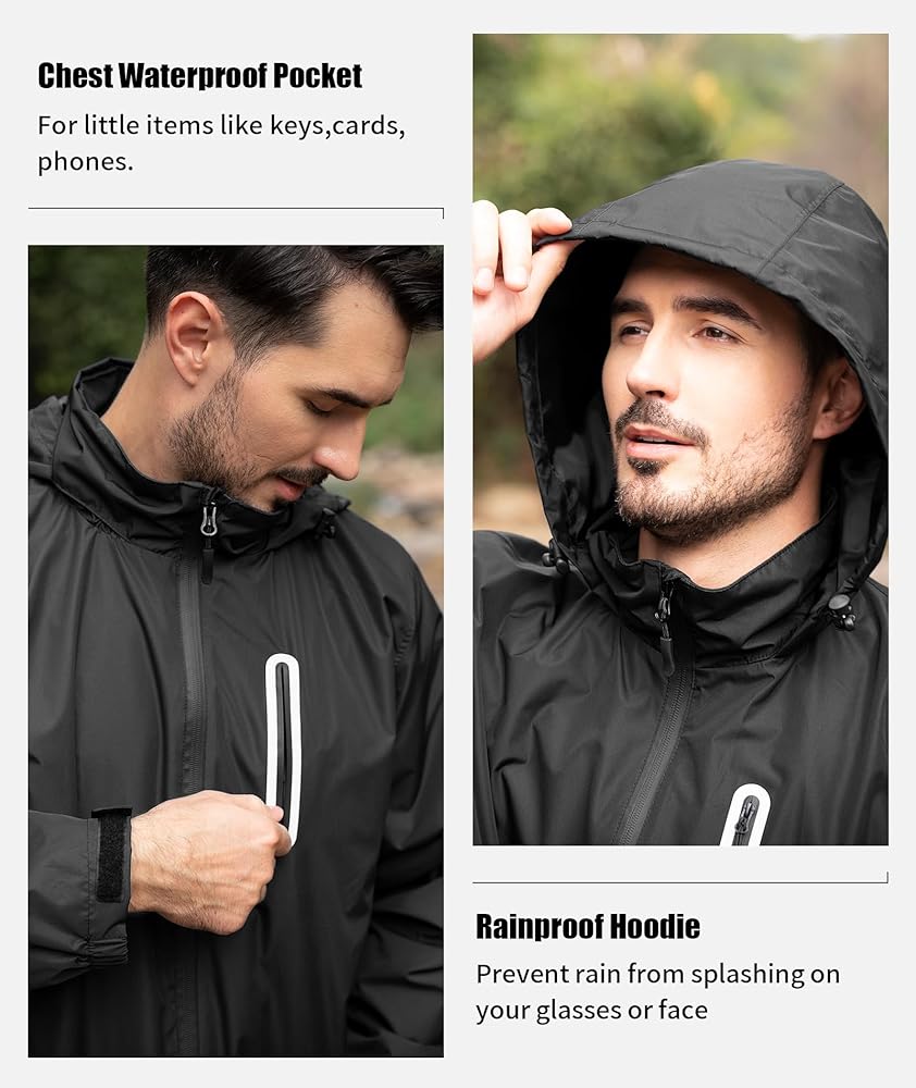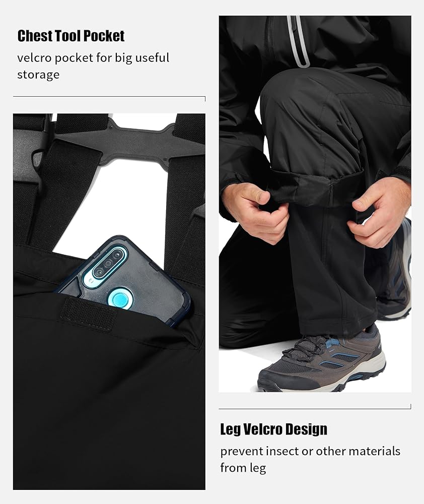 【Innovative Functional Jacket】Swisswell men's rain jacket has been innovatively upgraded with a concealable hood that can be rolled into the collar.1 chest waterproof zipper pocket and 2 side waterproof zipper pockets on jacket,1 chest pocket on bib that stores your phone or tools provided extra storage space