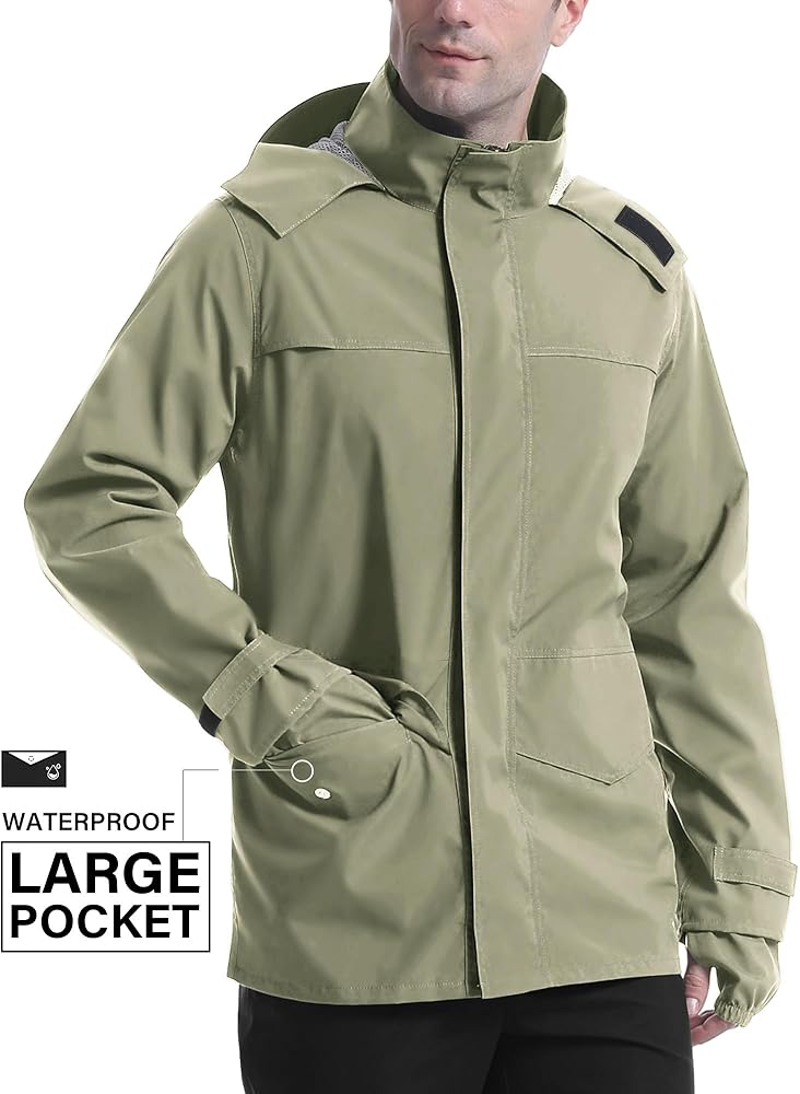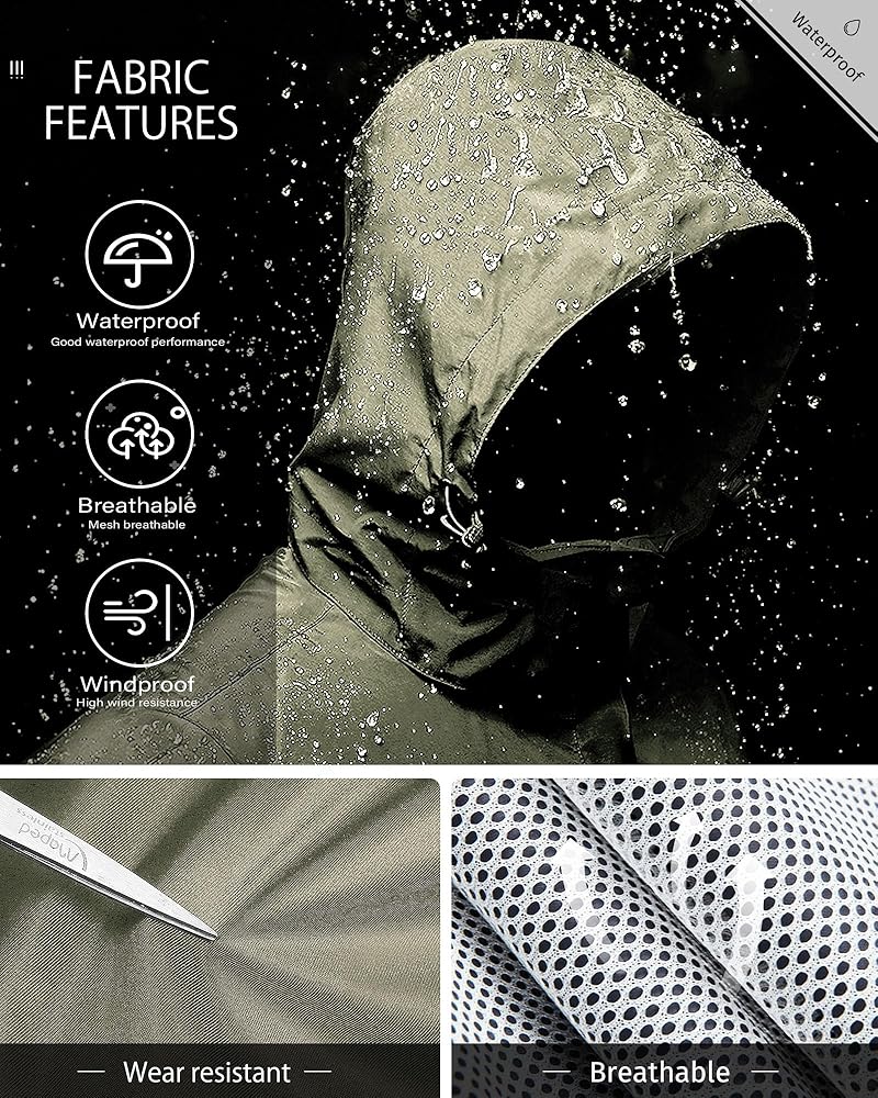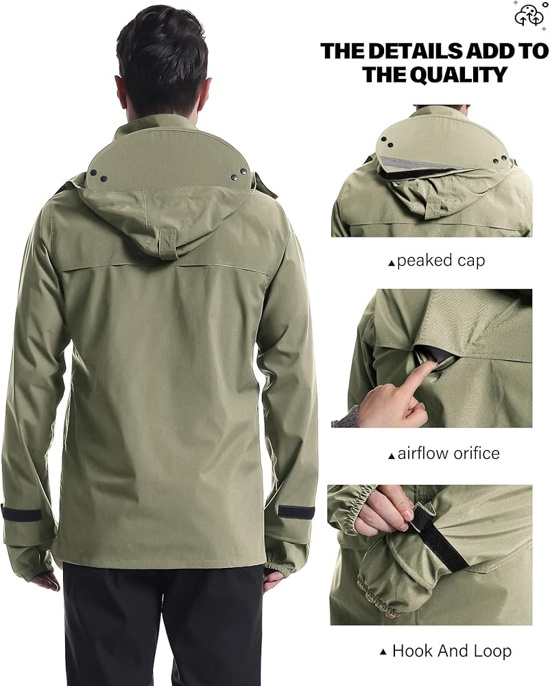 Rainproof: Men's waterproof rain coat The surface layer has a Lotus Leaf Waterproof function.The seams are sealed with a special waterproof membrane at high temperature.Waterproof up to 5000mm H2O.100% waterproof,Keeps you dry all day long