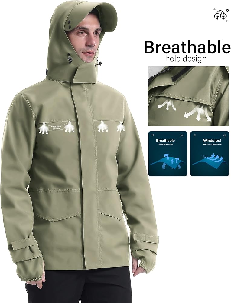 Breathable: Mens rain gear with hood The front chest has two ventilation holes on the left and right side, and the back has four ventilation holes,And four ventilation holes on the back.Super breathable. Breathability rating: 3000 g/m2/24 hrs
